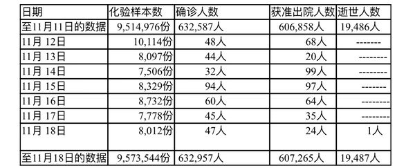 缅甸卫生部2022年11月12日至11月18日每晚8时所公布的疫情情况分别如下:
