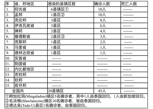 确诊者45人,来自9个省邦地区的20个县镇区,确诊者中有13名国外回归者(12人由泰国回归,1人由新加坡回归)。国内确诊者32人中仰光省占8人(恰为 ¼ 的比例),各省邦的国内确诊人员为仰光省的3倍。各省邦国内 确诊人员24人中,克伦邦8人,伊洛瓦底省6人,掸邦4人,曼德勒省国内确诊者及克耶邦各为2人,马奎省及德林达依省格1人。孟邦首府毛淡棉县区有10名确诊者自泰国回归,仰光省明加拉洞镇区有2名确诊者自国外回归(1人由泰国回归,1人由新加坡回归),曼德勒省德达吴县区也有1名确诊者自泰国回归。