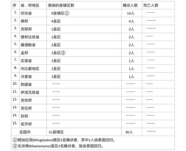 缅甸卫生部于11月23日下午4时发布公告,全国各省邦,11月22日的确诊人数30人无死亡人数,具体数据如下表: