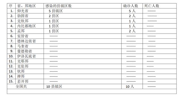 缅甸卫生部于11月28日下午4时发布公告,全国各省邦,11月27日的确诊人数10人无死亡人员,具体数据如下表: