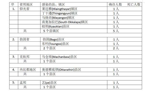 确诊者10人,来自5个省邦地区的10个县镇区,平均每个县镇区就各只有1名确诊者。确诊者10人中仰光省占5人(恰为二分之一 的比例),各省邦的国内确诊人员也恰与仰光省相等。各省邦国内确诊人员5人中, 勃固省2人,克钦邦、内比都地区与孟邦各1人。