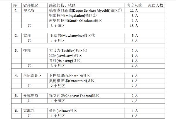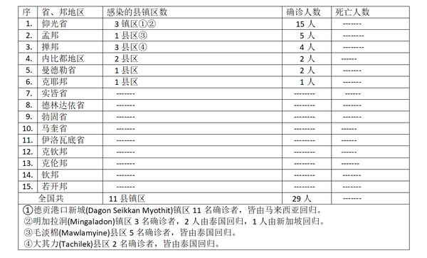 确诊者29人,来自6个省邦地区的11个县镇区。国内确诊者只有8人,其中仰光省也只占1人(恰为八分之一 的比例),各省邦的国内确诊人员也恰为仰光省的7倍。各省邦国内确诊人员7人中, 掸邦国内确诊人员、内比都地区与曼德勒省各2人(掸邦另有2名确诊者由国外回归),克耶邦1人。