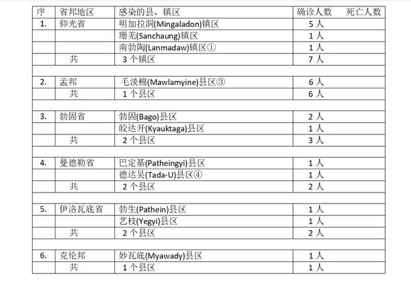 缅甸卫生部于11月30日下午4时发布公告,全国各省邦,11月29日的确诊人数21人无死亡人员,具体数据如下表: