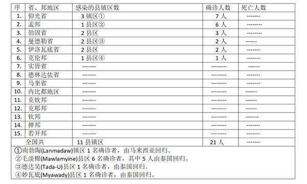 确诊者21人,来自6个省邦地区的11个县镇区。国内确诊者13人,其中仰光省占6人(接近 ½ 的比例),各省邦的国内确诊人员与仰光省相差不多。各省邦国内确诊人员7人中, 勃固省3人,伊洛瓦底省2人,孟邦国内确诊者及曼德勒省国内确诊者各1人(孟邦另有5名确诊者自国外回归,曼德勒省另有1名确诊者自国外回归)。