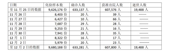 缅甸卫生部 (2022年12月2日)晚上8时最后发布的公告中说,12月2日全国确诊人数20人,与12月1日相比增加4人;当天无人因疫情而死亡,与12月1日相持平。