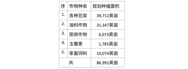 在今年冬作物种植季节时,本漂县规划种植各种豆类、油料作物、厨房作物、玉蜀黍及家畜饲料等作物共86,991英亩,各种作物规划种植的面积如下表: