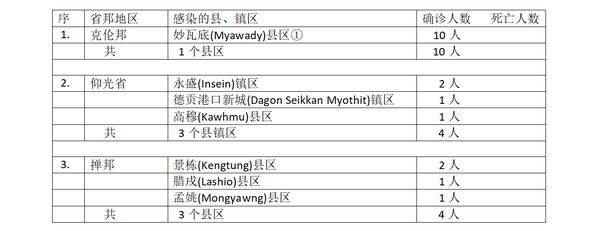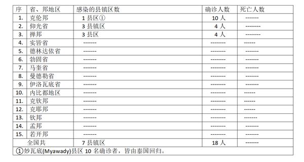 确诊者18人,来自3个省邦地区的7个县镇区。确诊者中有10人为国外回归者(皆由泰国回归),国内确诊者8人,仰光省3个县镇区占4人,恰为 ½ 的比例,另外掸邦感染的县区数及确诊人数与仰光省一样,同样是3县区4人。其他省邦除克伦邦有10名国外回归的确诊人员10人外,都是零确诊地区了。