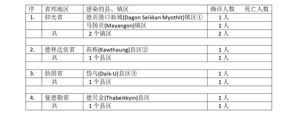 12月12日这一天缅甸全国确诊人数5人,确诊人员来自全国4个省区,分别为:仰光省、德林达依省、勃固省及曼德勒省等4个省区,其余11个省邦地区为零确诊地区。各省邦地区感染的县镇区及确诊人数如下表: