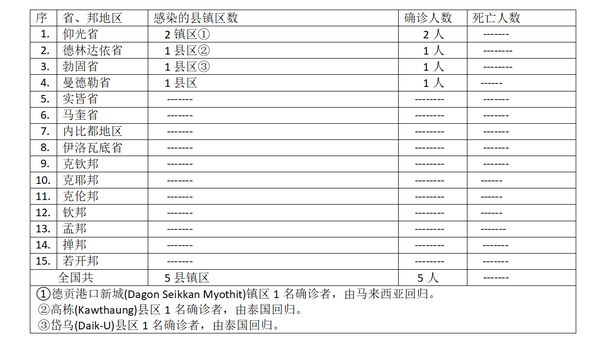 确诊者5人,来自4个省区的5个县镇区。确诊者中有3人为国外回归者(1人由马来西亚回归,2人由泰国回归),国内确诊者只有2人,仰光省区及曼德勒省区各占1人。
