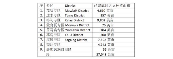作为冬作物,实皆省全省规划种植大豆35,000英亩。在省内8个专区及那加民族自治区属下的各县区,自10月初就开始有关种植工作,直到12月份的第1周,共完成了大豆27,000多英亩的种植工作。