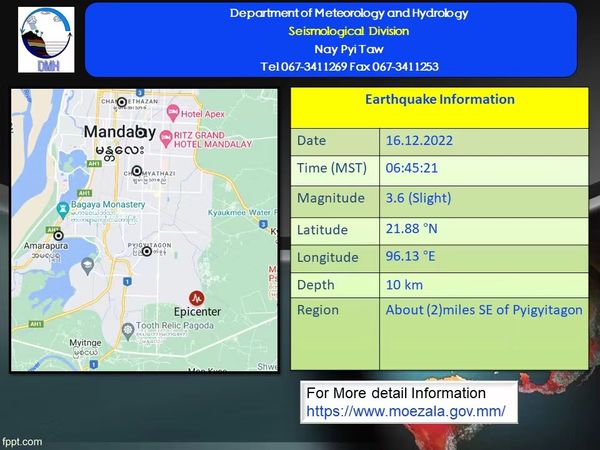 12月16日早上6时45分21秒,在曼德勒省比基得昆镇(Pyigyidagun)东南方向2英里处;北纬21.88度、东经94.13度处发生了深度为10公里的3.6级地震。