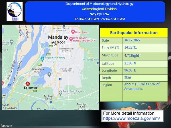 12月16日中午14时28分31秒,在曼德勒省阿马拉不拉镇(Amarapura)东西方向3英里处;北纬21.88度、东经96.03度处发生了深度为9公里的4.7级地震。