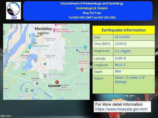 12月16日中午13时29分13秒,在曼德勒省密捏(Myitnge)东方向3英里处;北纬21.85度、东经96.12度处发生了深度为3公里的3.3级地震。