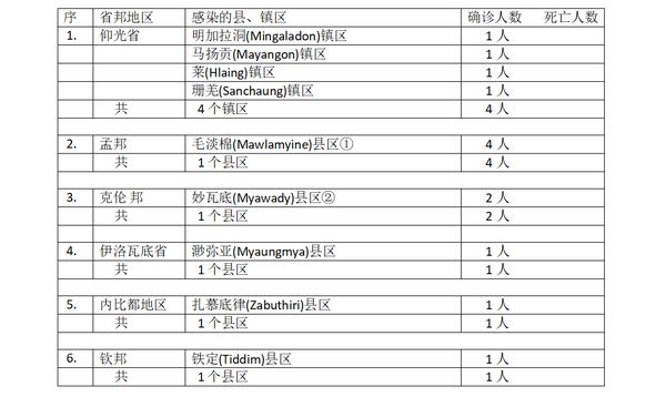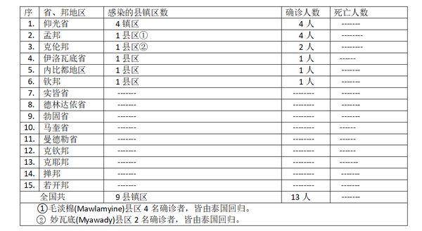 缅甸卫生部于12月16日下午4时发布公告,全国各省邦,12月15日的确诊人数13人无死亡人员,具体数据如下表: