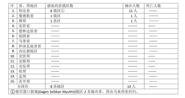 缅甸卫生部于12月20日下午4时发布公告,全国各省邦,12月19日的确诊人数13人无死亡人员,具体数据如下表: