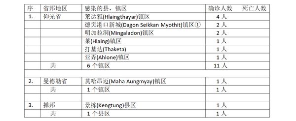 12月19日这一天缅甸全国确诊人数13人,确诊人员来自全国3个省邦地区—仰光省、曼德勒省及掸邦。其余 12个省邦地区为零确诊地区。各省邦地区感染的县镇区及确诊人数如下表: