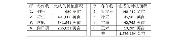 检查一下冬作物已完成的种植面积,可发现种植最多的是作物还是属于油料作物—芝麻、花生与向日葵。其次是豆类—黑麦豆与绿豆。而稻谷种植面积为最少。这可能是因为稻谷主要是在气候温暖的时刻到初夏季节时才能开始种植,目前只是在有条件的地方先行试种了一些而已。