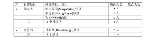 确诊者5人,来自2个省邦地区的4个县镇区。仰光省3个县镇区有4名确诊者,明加拉洞镇区2名确诊者,莱达雅镇区及礼固县区各1名确诊者。克伦邦丹洞基县区1名确诊者。各县镇区确诊人数都只是“数一数二”的人数,而全国感染者也只有2个省邦地区,都说明了疫情确实大大缓和了。