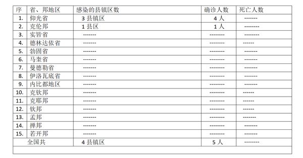 缅甸卫生部于12月23日下午4时发布公告,全国各省邦,12月22日的确诊人数5人无死亡人员,具体数据如下表:
