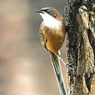 (六)白喉苦莺(White-throated babbler):苦莺英文名字为babbler,但在缅甸发现的苦莺品种被命名为白喉苦莺(White-throated babbler),其多见于缅甸中部及南部地区,特别是在仰光省、勃固省、曼德勒省、马奎省及实皆省南部见到的最多,是属缅甸本土鸟类品种。该鸟身长10英寸(约为25.4公分),而尾长就有5.5英寸(将近14公分)。该鸟类多是集体活动,由一簇草丛过渡到另一簇草丛觅食。其等的产卵育仔期为每年的4月份到6月中旬,通常一座鸟巢中会产3到4枚鸟蛋。该鸟类也是只见于缅甸境内,也是被定为绝种危机最低的鸟类。
