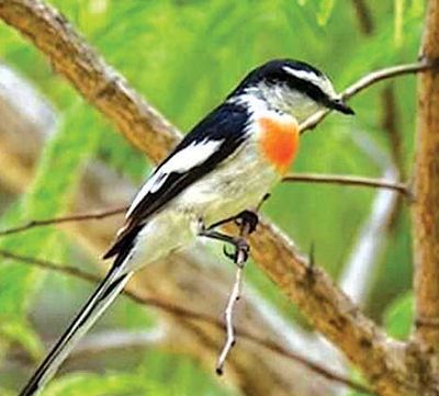 (四)白腹赤山椒鸟(Hooded Treepie):这也是仅见于缅甸境内的珍稀品种鸟类,在实皆省、曼德勒省、马奎省与勃固省内见到的最多,最常见生活于灌木丛及农田地区。