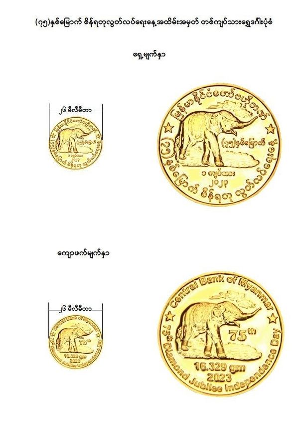 据国家新闻部报导,为75周年独立纪念日(编按:缅甸于1948年1月4日独立),将于元月5日出售铸有白象图案的金币。