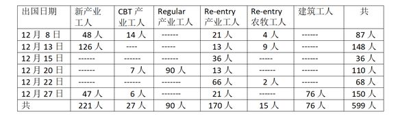 在这12月份派遣出国务工的劳工们,分为6批次前往韩国,分别是在12月8日、12月13日、12月15日、12月20日、12月22日及12月27日乘坐飞机出国的。