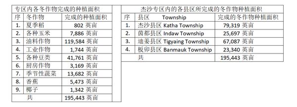 2022—23财政年度冬作物种植季节期间,杰沙(Katha)专区内的杰沙、迪姜(Tigyaing)、茵都(Inndaw)及板卯(Banmauk)等县区,已完成了冬作物19万多英亩的种植工作。