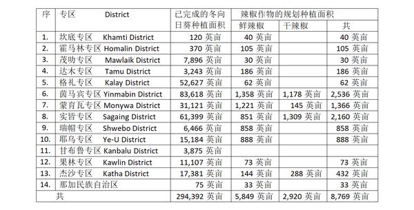 目前实皆省各专区所完成的冬向日葵种植面积及辣椒作物的规划种植面积如下表: