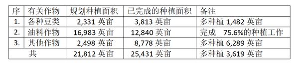 就冬作物全部的种植面积来说,规划种植21,812英亩,已完成25,431英亩的种植工作,应该说是超额完成了有关种植工作。但作物种类中,油料作物却没有完成规划的种植工作,只完成75.6%的种植工作,还差4,143英亩还未种植。油料作物是一重要作物,要解决民众们长期面临的“吃油难”问题,看来还要多加努力呢。