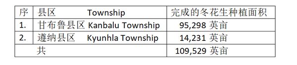 实皆省甘布鲁(Kanbalu)专区在2022—23财政年度冬作物种植季节时,在全专区的两个县区(甘布鲁县区及遵纳Kyunhla县区)内规划种植油料作物冬花生109,164英亩,现在实际种植了这冬花生109,529英亩,比原规划种植的面积多种植了365英亩。