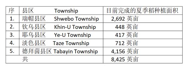 由德班色水坝提供农业用水的各县区,目前所完成的夏季稻种植面积如下表: