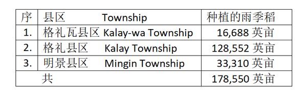 按:明景县区是格礼专区所属的3个县区之一(另外2个县区为格礼县区及格礼瓦Kalay-wa县区),2022年雨季稻种植时期,这3个县区所种植的雨季稻面积如下: