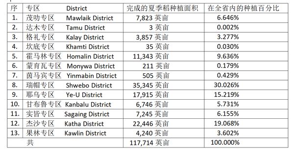 查看各专区所完成的夏季稻种植面积,以瑞帽专区完成的种植面积为最多,该专区目前完成的种植面积为全省完成的种植面积的30%。其次是杰沙专区, 耶乌专区位居第三,霍马林专区位居第四。这4个专区完成的种植面积几乎就是全省完成种植面积的 ¾ 。这4个专区完成的种植面积都在1万英亩以上。其余专区目前完成的种植面积都在8,000英亩以下了。