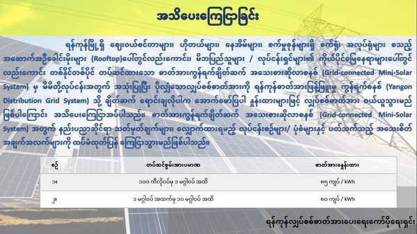 仰光市使用太阳能的用户如有多余的电力可以向仰光电力供应公司出售。 该公司将从1兆瓦到10兆瓦电力以每千瓦时80缅币,100 千瓦到 1 兆瓦以每千瓦时 85 缅币的价格收购电力。
