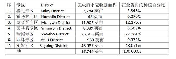 2022—23财政年度冬作物种植季节期间,实皆省方面曾规划在格礼专区、霍马林专区、蒙育瓦专区、茵马宾专区、瑞帽专区、耶乌专区及实皆专区这7个专区种植小麦102,670英亩,到种植季节结束时,完成了这小麦97,746英亩的种植工作,算是完成了规划面积的95%的种植工作。这些小麦已在进行采收工作,目前已百分之百地完成了有关采收工作,小麦每英亩的平均产量为20.88缅箩,这是由实皆省省农业局方面获知的讯息。