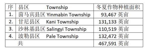 实皆省茵马宾(Yinmabin)专区内的茵马宾、甘尼(Kani)、沙林基(Salingyi)及波勒(Pale)四县区,在2022—23年度冬、夏两季节中共种植了各种庄稼作物46多万英亩。