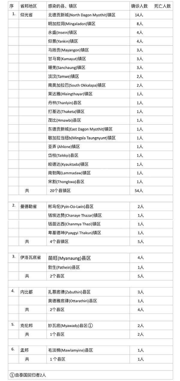 缅甸卫生部于4月24日下午4时发布公告,全国各省邦,4月23日的确诊人数为45人,无死亡人数,具体数据如下表: