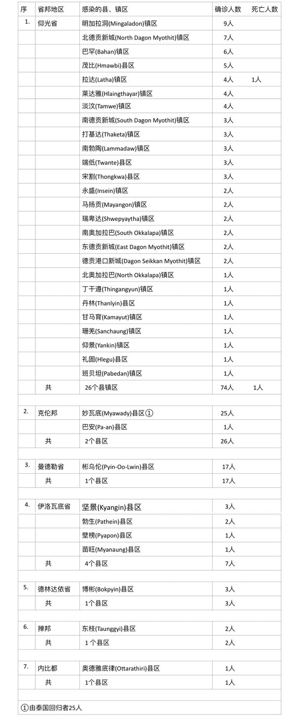 4月29日下午4时缅甸卫生部发布公告,全国各省邦,4月28日的确诊人数为77人,死亡人数1人,具体数据如下表: