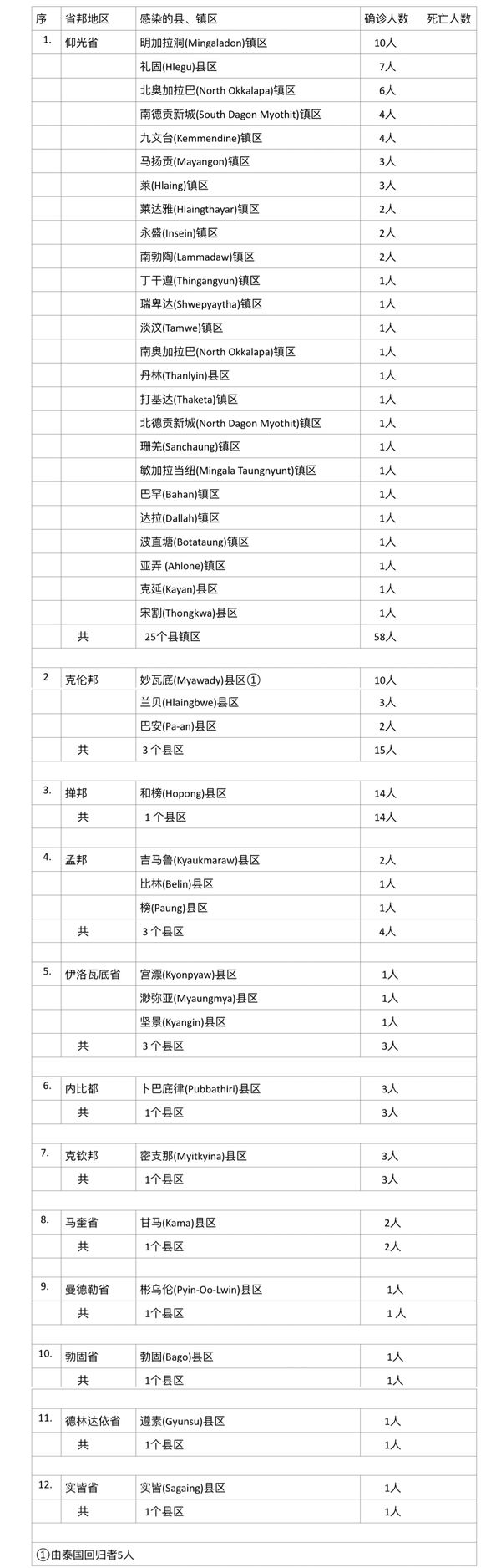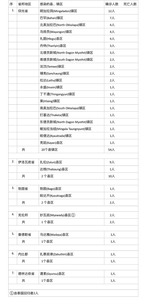 缅甸卫生部公布各省邦地区疫情蔓延情况