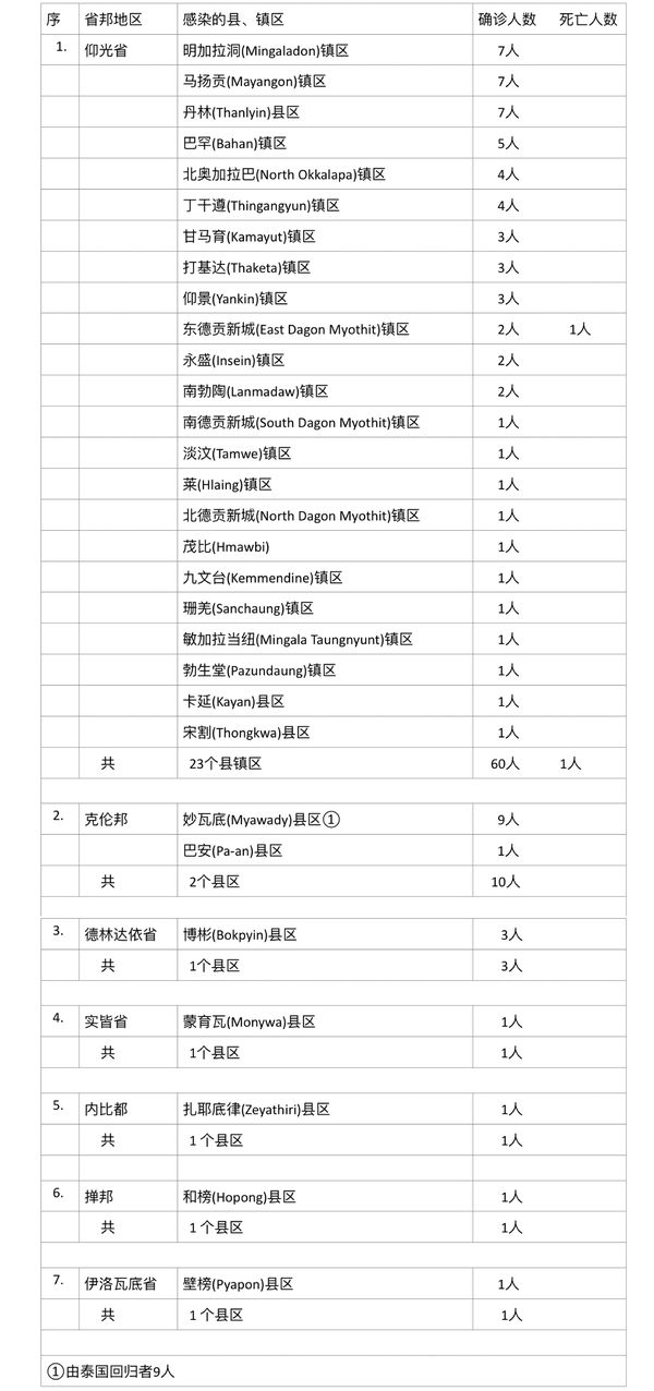 5月1日下午4时缅甸卫生部发布公告,全国各省邦,4月30日的确诊人数71人,无死亡人数,具体数据如下表: