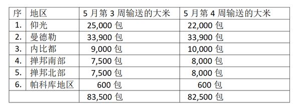 5月份第3周及第4周由瑞帽专区向缅甸各地输出的大米数量如下: