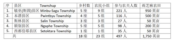 马奎省敏巫(Minbu)专区内的敏巫(斯固Sagu)县区、本漂(Pwintbyu)县区、额别(Ngaphe)县区、斯林(Salin)县区及西都岱耶(Setoktara)县区内的18个乡村内,在2023—24财政年度雨作物种植季节期间,将采用GAP(良好的农业规范)制度种植1,700多英亩的雨芝麻作物。