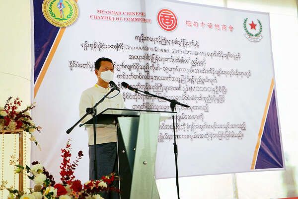 缅甸中华总商会会长林文猛在在自费接种国药疫苗启动仪式上致词