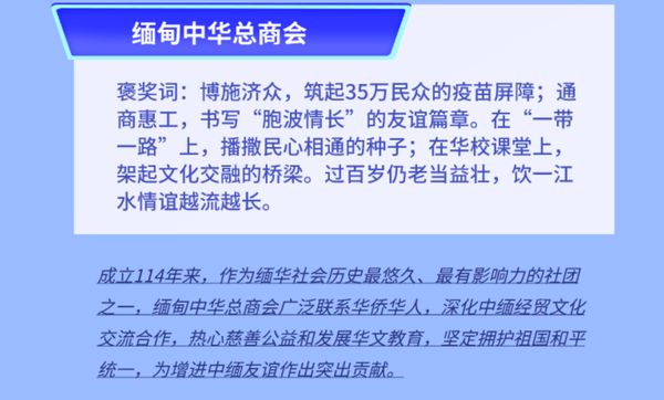 缅甸华社9位代表荣幸受邀出席,同时缅甸中华总商会荣获授予华社之光桂冠荣誉,这不仅是缅甸中华总商会的殊荣,更是全缅华社的共同荣誉!这也是祖籍国对海外华侨华人的亲切关怀和支持,对华侨华人与侨团的贡献充分肯定和褒奖!