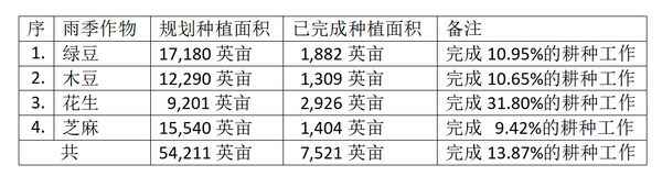 去年雨季各作物的种植情况,绿豆2,676英亩,木豆400英亩,花生8,349英亩,芝麻2,458英亩。今年规划种植的面积比去年的种植面积增加了许多,例如木豆就因为获得了好价钱比去年种植面积扩大了好多倍。而多年来农民们都专注种植油料作物花生,每年种植的花生(包括雨花生及冬花生)面积都达到10万英亩左右。