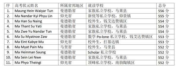 而文理科的10名高考状元中,男生女生各占5人。而且10人中有9人是校外生,1人来自实皆省霍马林的私立学校。这文理科10名高考状元中,来自实皆省及伊洛瓦底省各3人,而孟邦、克伦邦仰光省及德林达依省各1人。