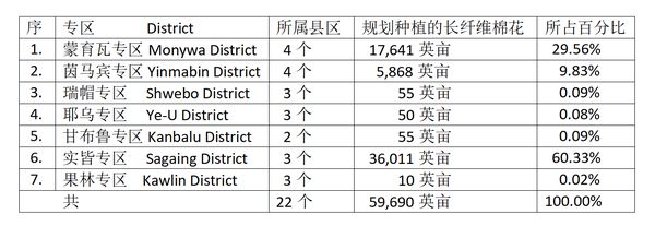 按:检视一下本年度实皆省内规划种植长纤维棉花的情况,会发现7个专区内只有3个专区的长纤维棉花种植有一定的规模,其他4个专区的种植面积就显得太少了。7个专区中这长纤维棉花种植面积最多的专区是实皆专区,其长纤维棉花的种植面积占全省规划种植面积的五分之三以上。第二种植面积最多的专区是蒙育瓦专区,其规划种植面积占全省规划种植面积的近30%。第三种植面积最多的专区是茵马宾专区,这三个种植面积最多的专区,其等的规划种植面积就已超过全省规划种植面积的99%以上了。期望这些专区都能完成其等的规划种植面积,为当地民众们带来一定的收益。