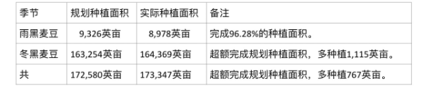 虽然在雨作物种植时期,这黑麦豆比规划面积少种植348英亩,但在冬作物种植季节期间,这黑麦豆比规划面积多种植了1,115英亩,故全年内这黑麦豆比规划面积多种植了767英亩。