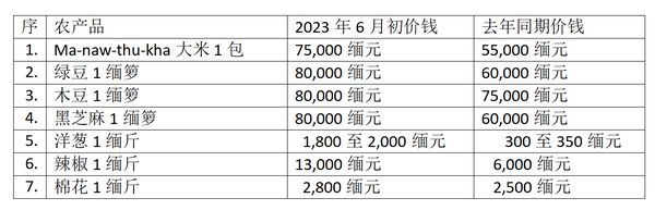 另据6月20日出版的《缅甸之光》报报导,2023年6月初在密铁拉专区内的市场上各种农产品(Ma-naw-thu-kha大米、木豆、黑芝麻、洋葱、辣椒、棉花)的价钱与去年同期相比都上扬,所以农民们都获益良多,在今年雨作物季节时都扩大种植了有关作物,这是由当地农夫们那儿获知的讯息。